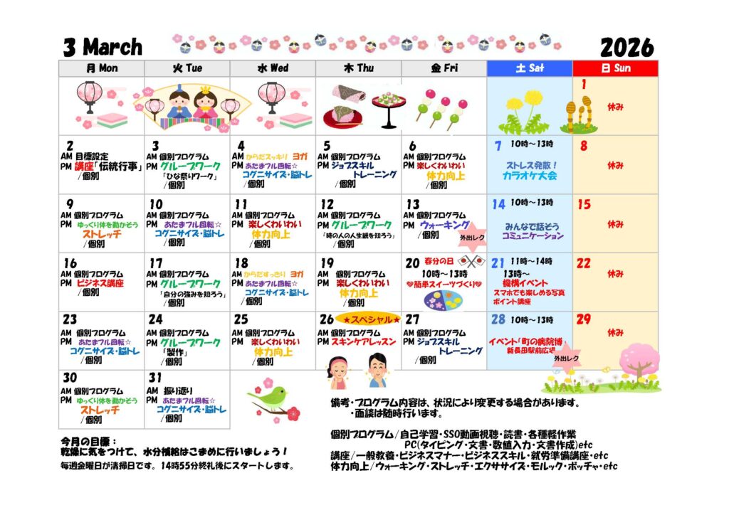 春はもうすぐ!充実の運動プログラムと楽しいイベント盛りだくさんの3月プログラムのお知らせです2026.3.2