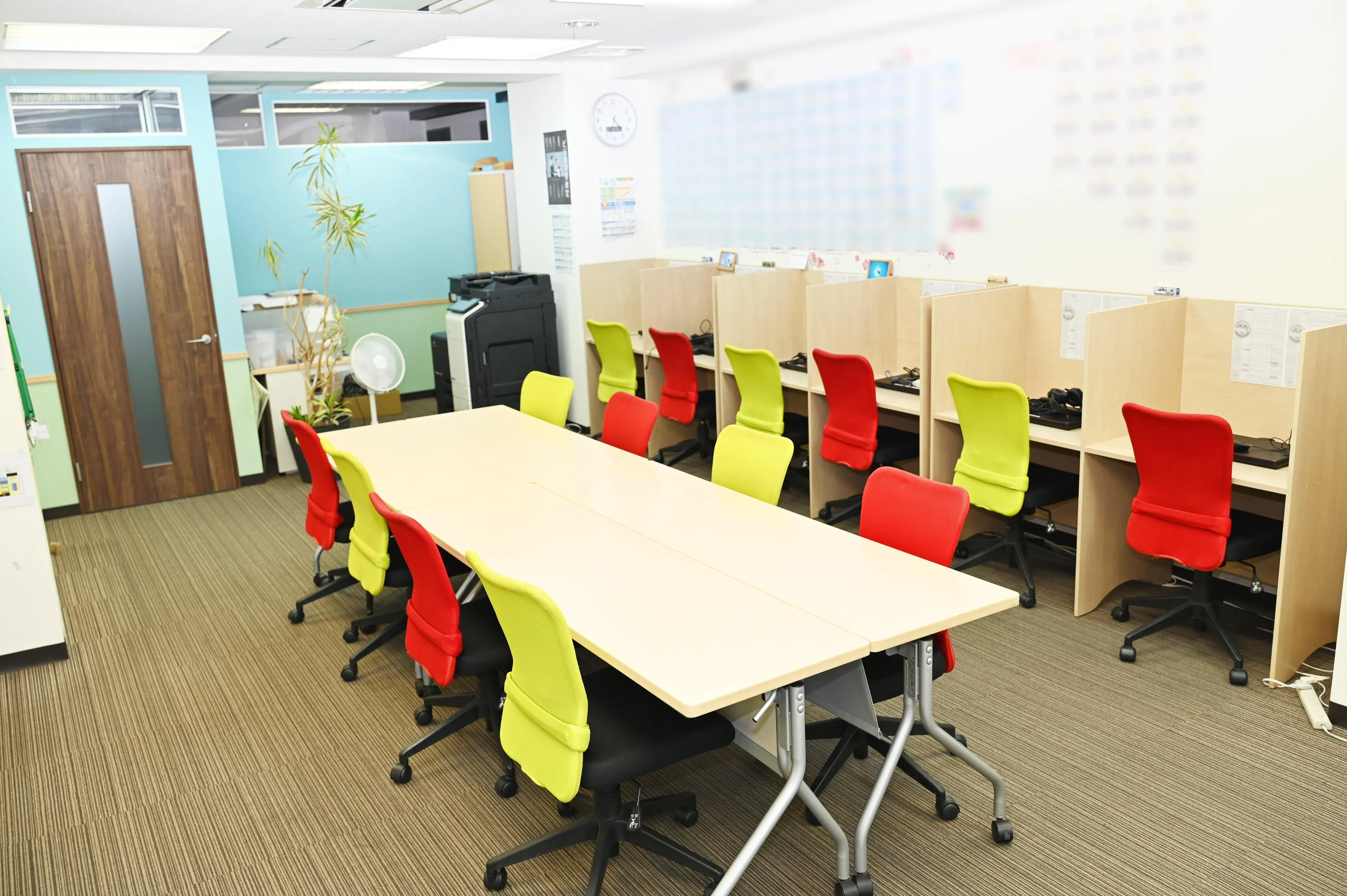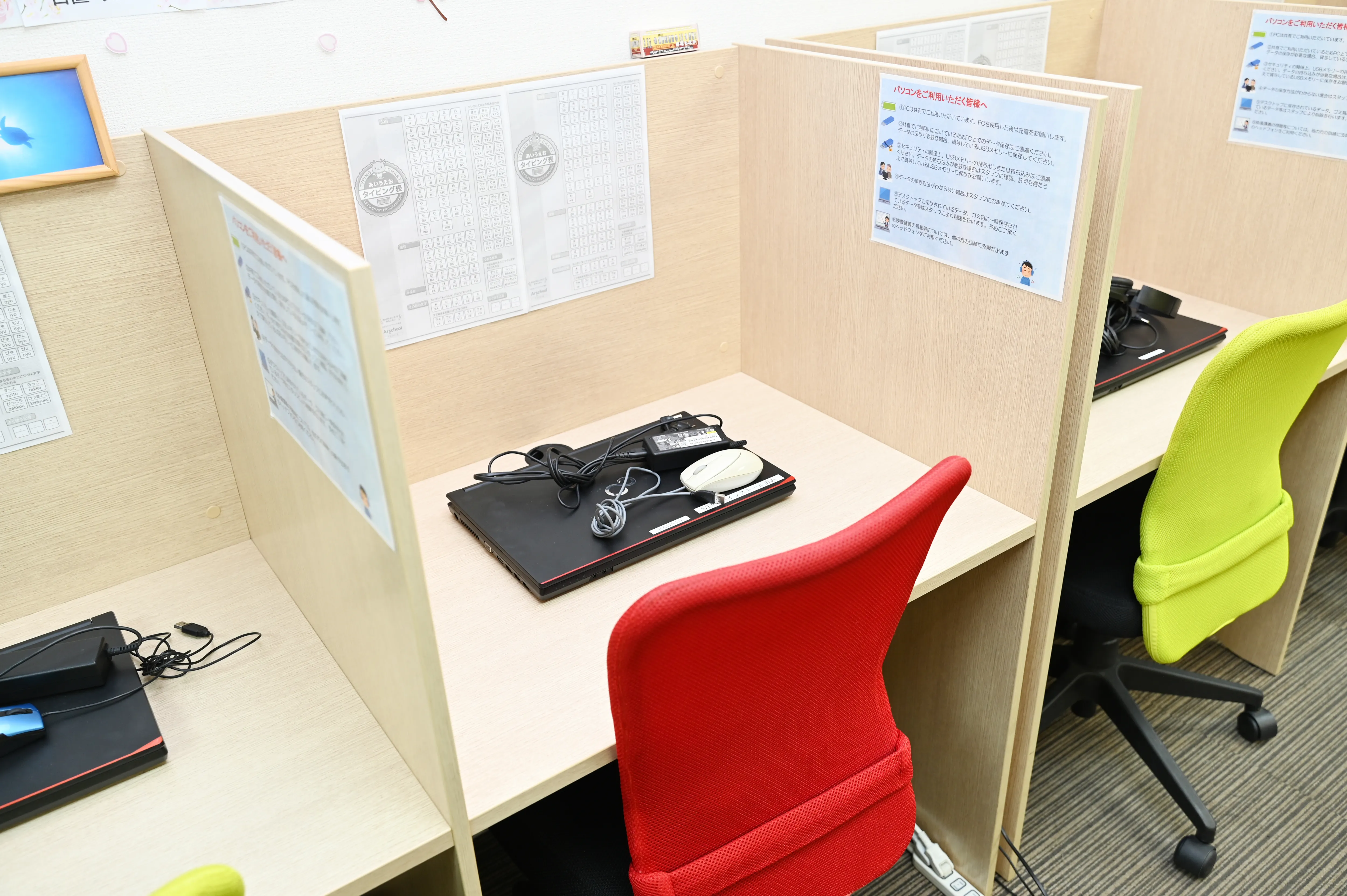 個別訓練ブースも用意しております。一人で集中してパソコンや学習を行いたい方に最適です。